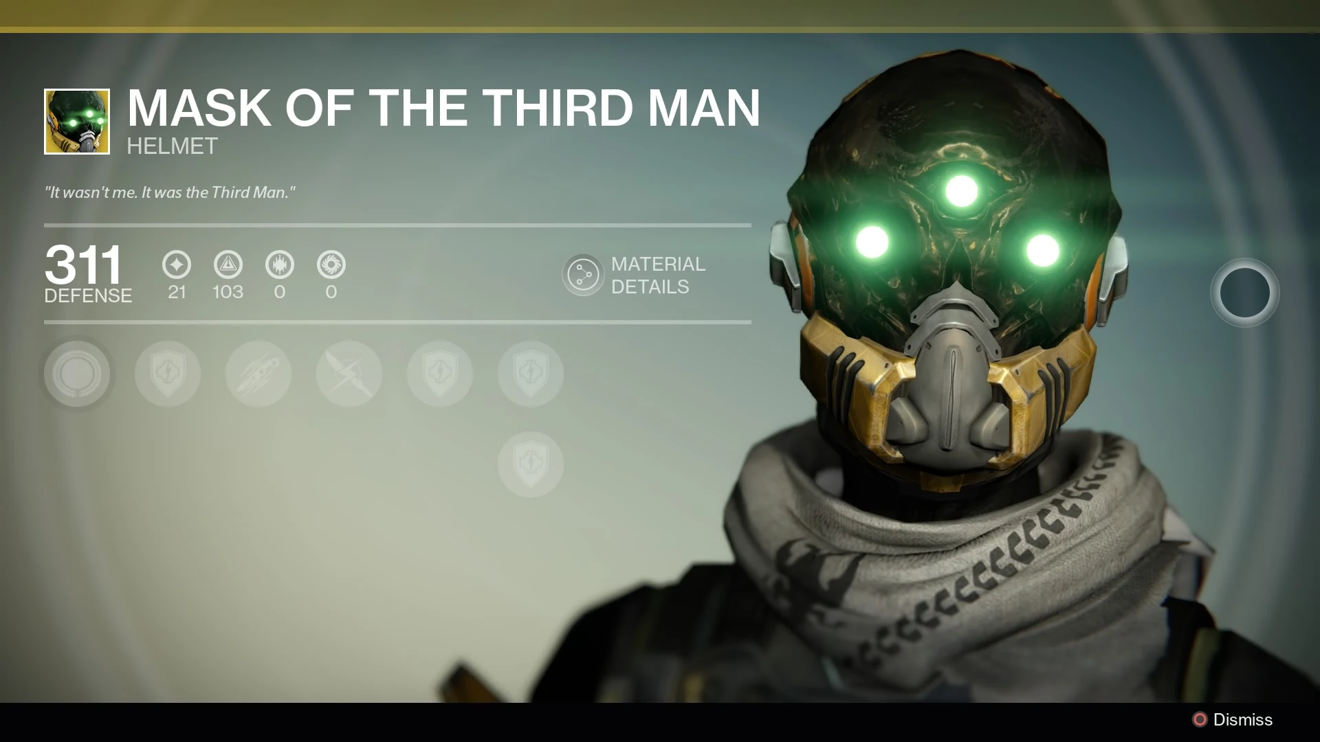 Mask of the Third Man is an exotic Hunter helmet. It can be purchased from Xûr in the Tower or obtained from an engram. It is designed to be used with the Bladedancer Hunter subclass.